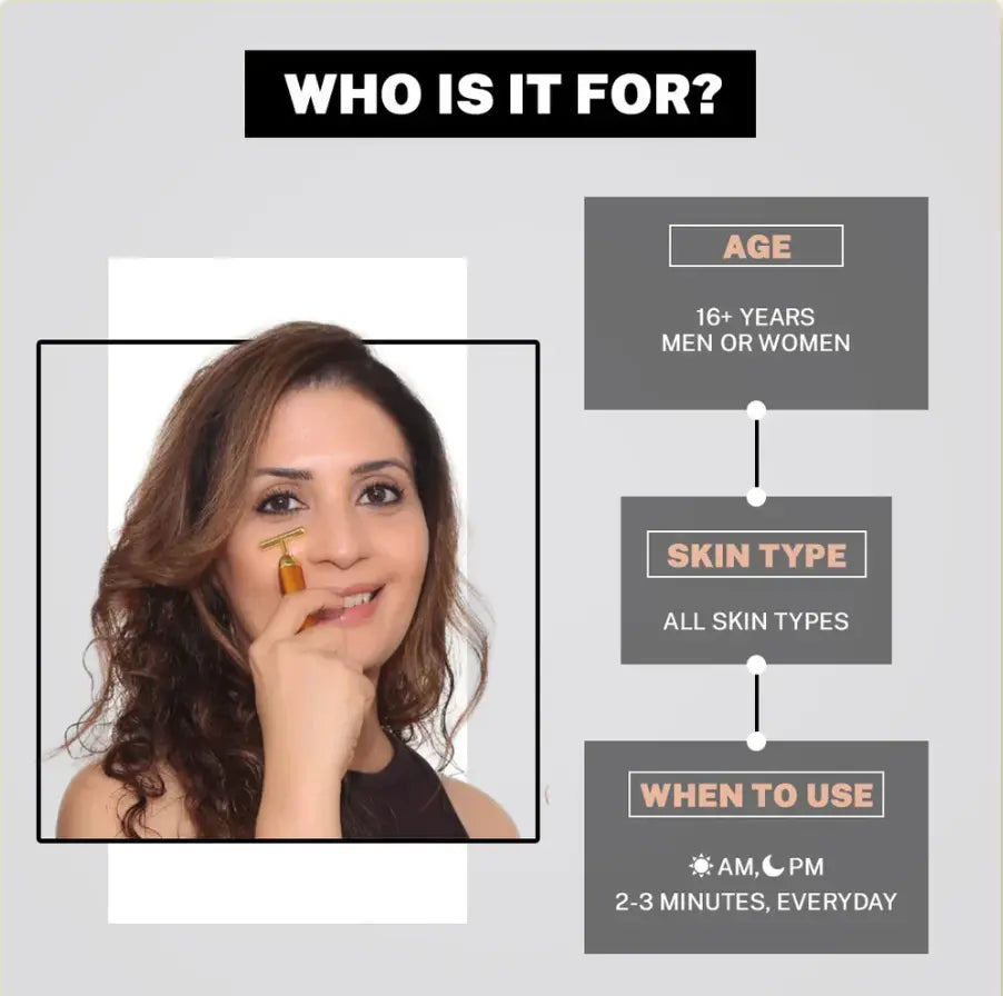 Crafted from high-quality brass and aluminum with a luxurious 24K gold-plated surface, it is safe, antibacterial, and gentle on all skin types. Regular use helps improve blood circulation, tighten skin, and boost the effectiveness of your skincare products. Its waterproof design allows convenient use even in the bathroom—making it your perfect daily beauty ritual for a youthful, refreshed look.